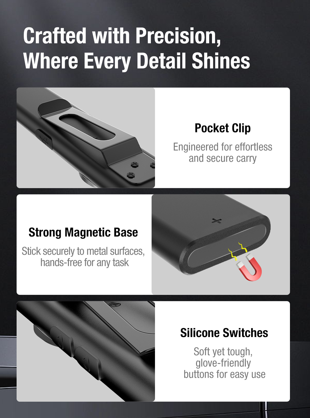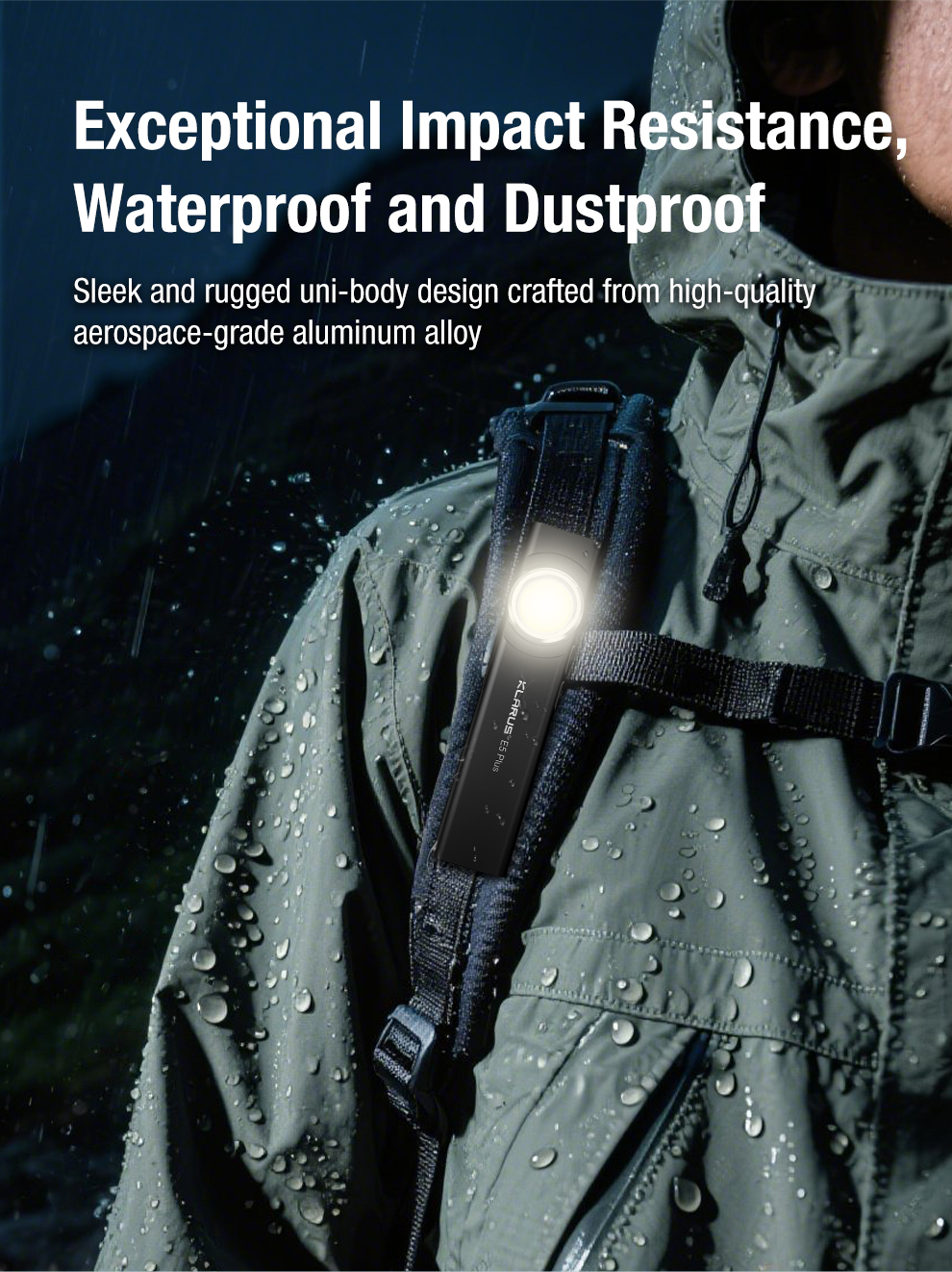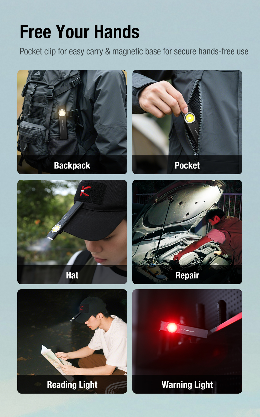 Die kompakte Größe von 113mm x 25mm x 8mm bei einem Gewicht von nur 35,8gr erlaubt einen extrem flexiblen Einsatz, als Cliplampe am Rucksack, an der Kleidung, als Werkstattlampe, als Campinglampe bis zur Anbringung an der Base Cap.