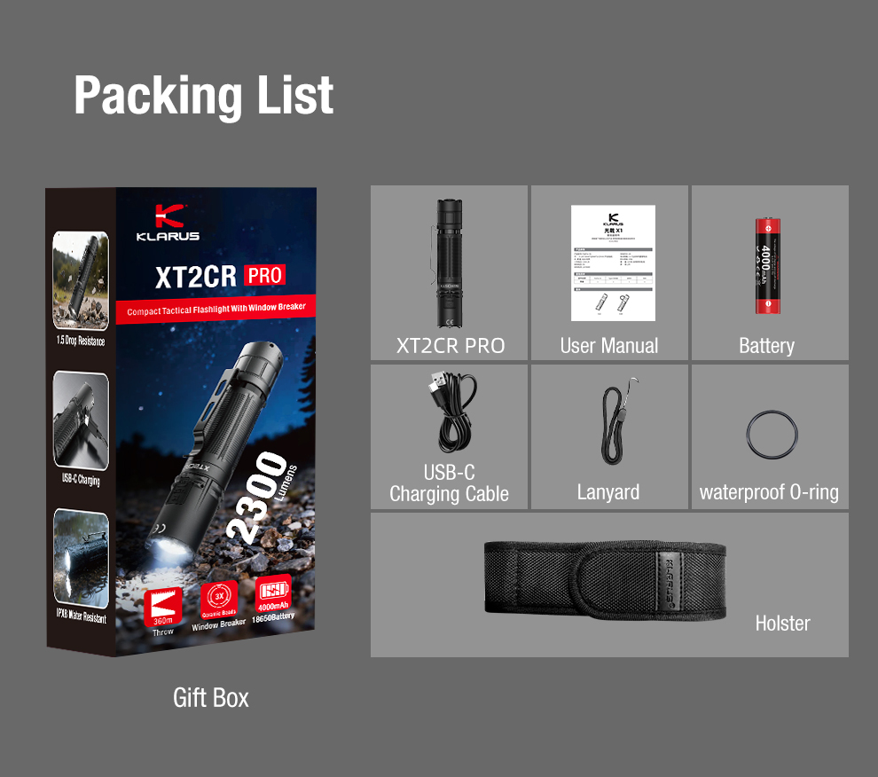 Lieferumfang: XT2CR Pro TacMaster, 4000mAh Lithium Akku, Holster, USB-C Ladekabel, Ersatz O-Ring