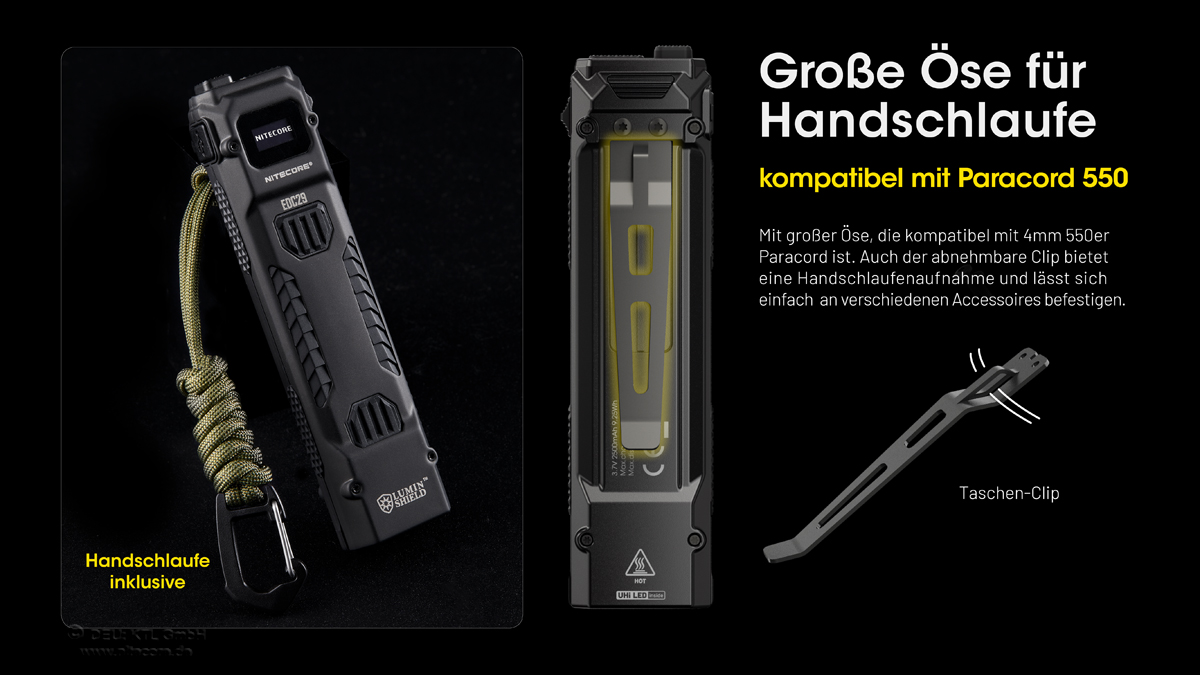 Lieferumfang: Nitecore EDC29, USB-C-Ladekabel, Lanyard, Clip, Bedienungsanleitung